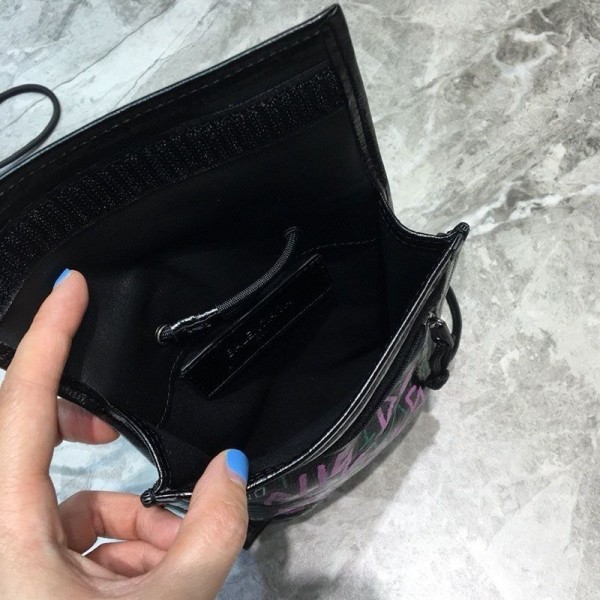 Borsa Balenciaga Explorer con tracolla in pelle di agnello Graffiti nera-Borsa Balenciaga Explorer nera.-100% pelle di agnello, testo e loghi multicolori stampati ovunque. - Tracolla sottile.-Chiusura frontale con zip.-Portafoglio con tracolla con chiusura a patta.-Tasca interna applicata.-Dimensioni: 15,5 * 19 * 4 cm.